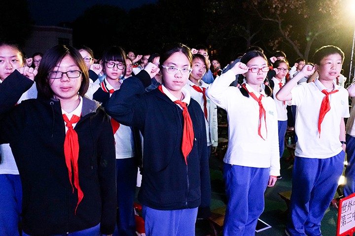 转眼间,六点半的钟声已然敲响,同学们聚集在了广场上,期待已久的十四岁生日仪式晚会开始了。出旗后,赵蕾副校长寄予了她对我们的期望,并点亮了青春火炬。青春不只有梦想,更意味着行动和担当。在辅导员的带领下,我们为青春许下了无悔的誓言,并换上了象征成长的崭新大红领巾。