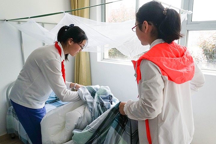 伴着宜人的春风,学生们来到了位于松江佘山的江秋基地。在简单的入营式后,同学们回到各自寝室,进行内务整理。铺床单、套被套、挂蚊帐,不仅锻炼了自理能力,还让同学们学会承担起生活的责任。随后,我们参观了队史馆,近距离了解了少先队的成立与历程,更加深了对胸前红领巾的感情。