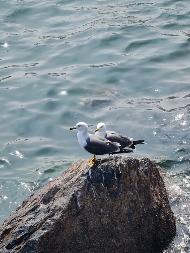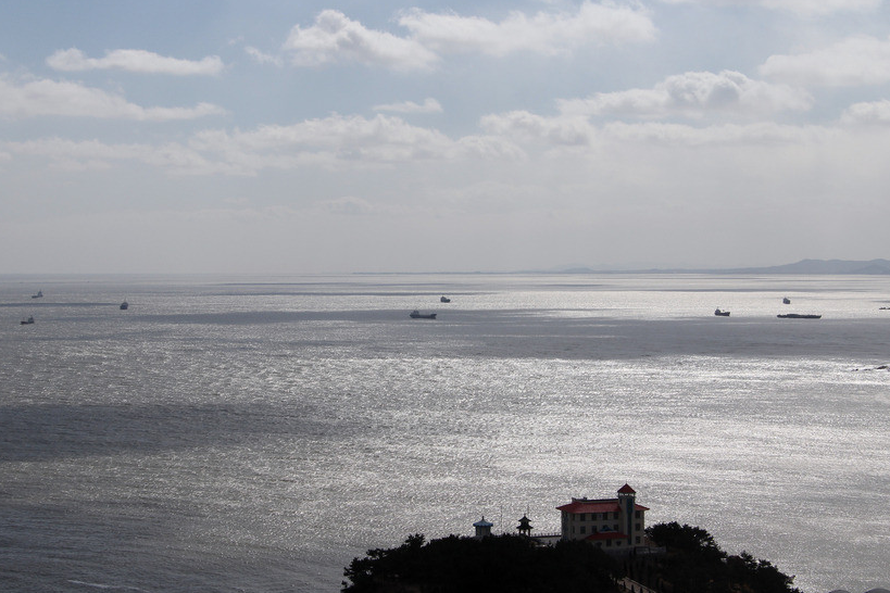 我站在高崖之上,在习习海风之中,往南看往北看,仿佛看到了我到过的长江口与鸭绿江口;往东看往西北看,仿佛看到了我乘船去过的韩国和渤海海峡。极目远眺,水天一色;俯瞰近处,碧波滚滚。