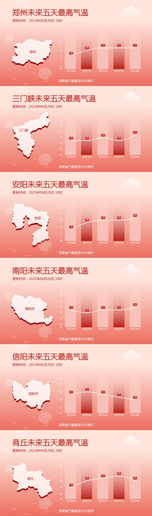 ?6月21日22时58分将迎来夏至节气,今日起,河南全省最高气温持续升高。据河南气象,22至26日北部、中东部最高气温将达37度以上,部分县市可达39到40度。高温持续笼罩端午假期,外出一定要避开高温时段,提前做好防暑降温工作,避免中暑。