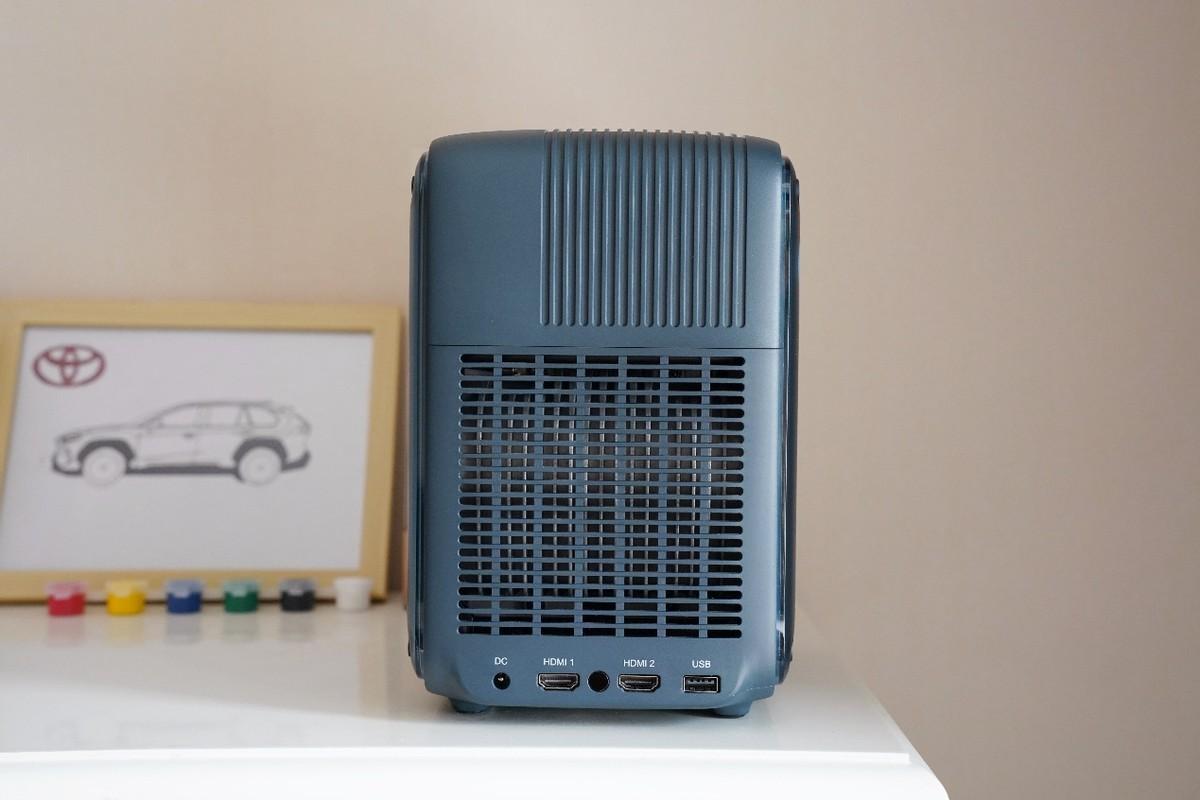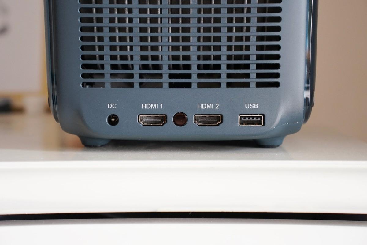 看到投影仪背部我想起了路由器的底部散热,整个大面积的散热格栅可以使机器长时间运转时的温度散发出去。顺着背部的散热格栅位于最底下的为四个接口,分别为电源DC接口、两个HDMI接口(不过相同价位段的一般是一个)、一个USB接口,对于投影仪来说这几个接口比较常规了,插在笔记本上、游戏主机等,效果要比我们的显示器屏幕强很多,特别是游戏主机的场景,这也是我选择这款投影仪的原因,与Switch搭配玩王国之泪真的很爽。
