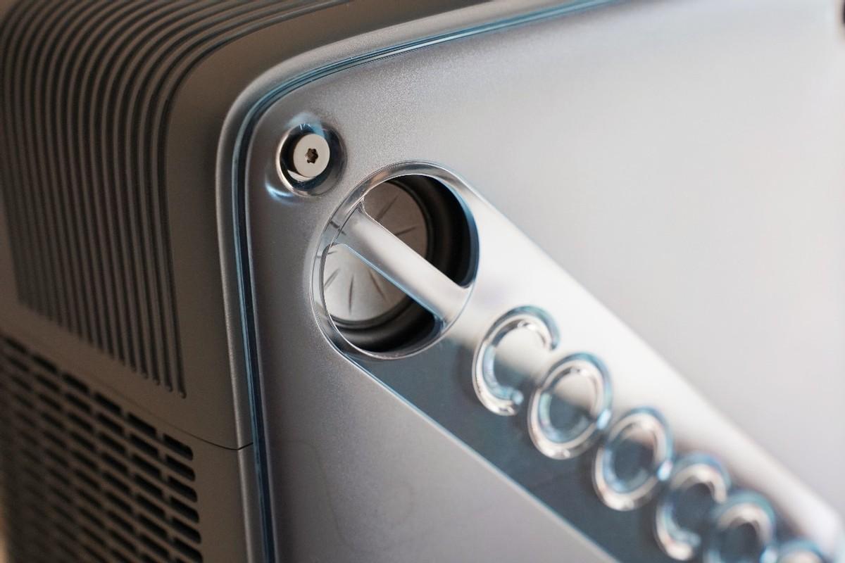 机身的侧面材料不同于其它位置,采用了类磨砂的纹理,摸上去手感也不差,可能是考虑到搬运时指纹遗留的属性而设定。投影仪内卷除了流明亮度之外,剩下的音质也算是一个亮点,比如说采用某些豪华车定制音响系统,或采用新技术或新材料的定制扬声器,它们带来的体验确实要比几年前的投影仪效果好一大截。酷开这款采用了全频扬声器,位置定于机器的右上方,别看外观挺小巧的,但其實有500CC的大音腔,且由原哈曼卡頓金耳朵調音,实际的体验确实不差。