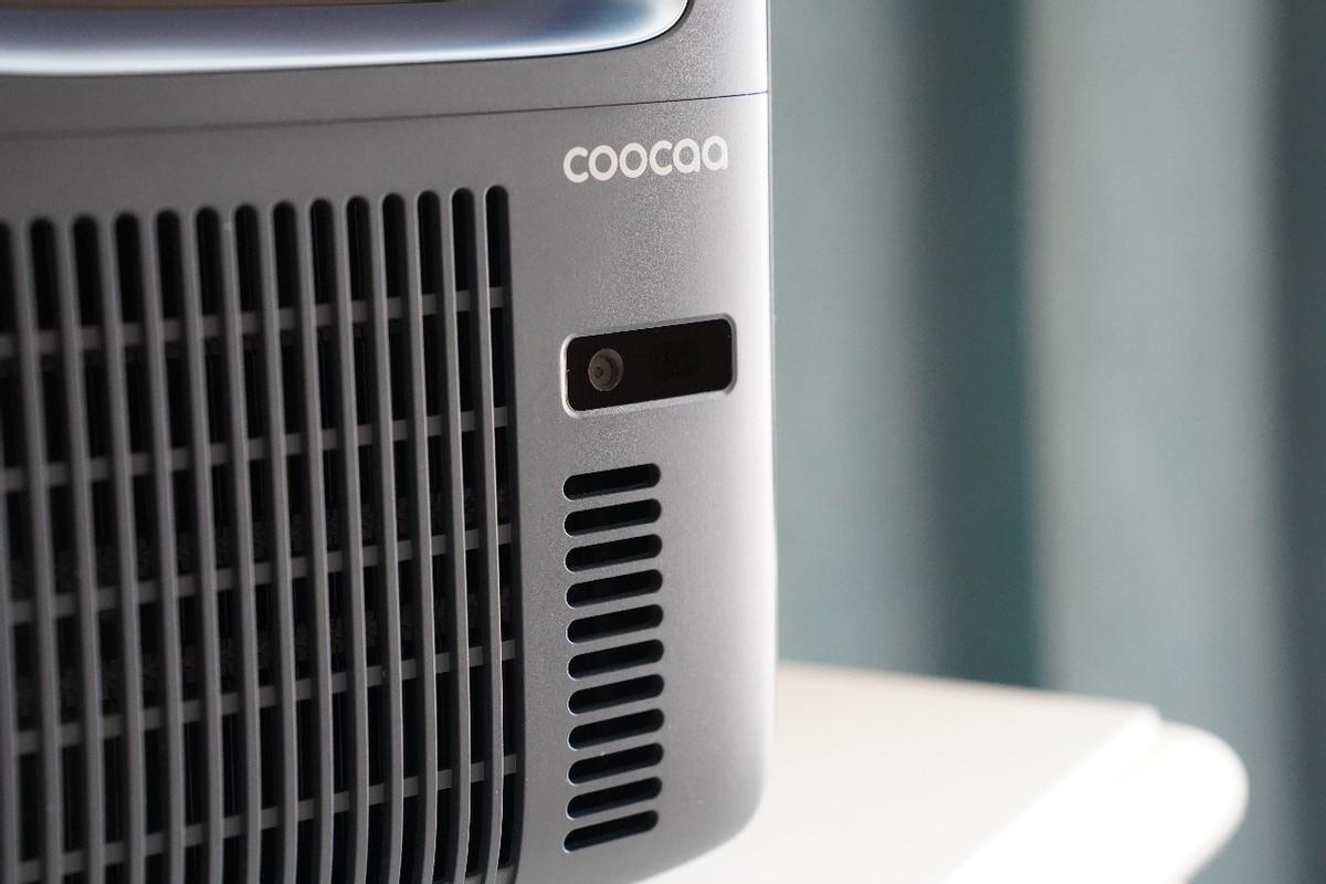 在光源下方,也就是酷开logo下面的为提供自动梯形矫正的对焦摄像头和测距模组,这组传感器可以满足画面更稳定,即使不小心的晃动也能保证画面稳定,并自动校准,现在的投影仪几乎都会适配这些功能了,这是直接与体验挂钩的,阉割掉的就不要贪便宜去选择了。
