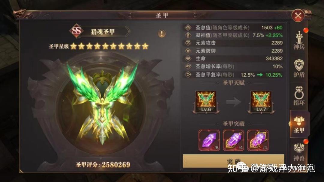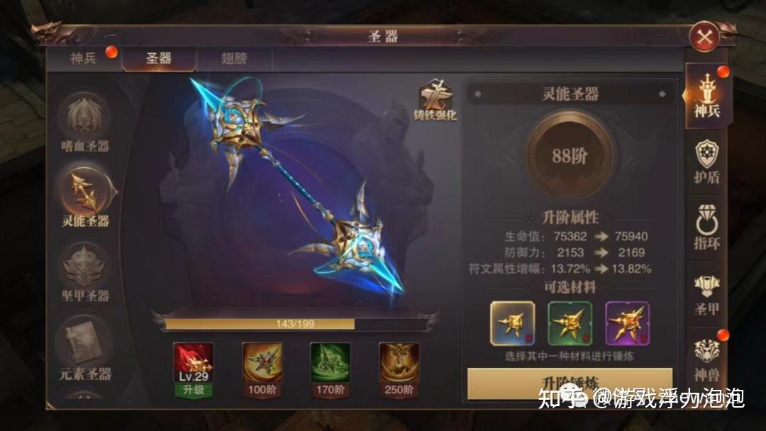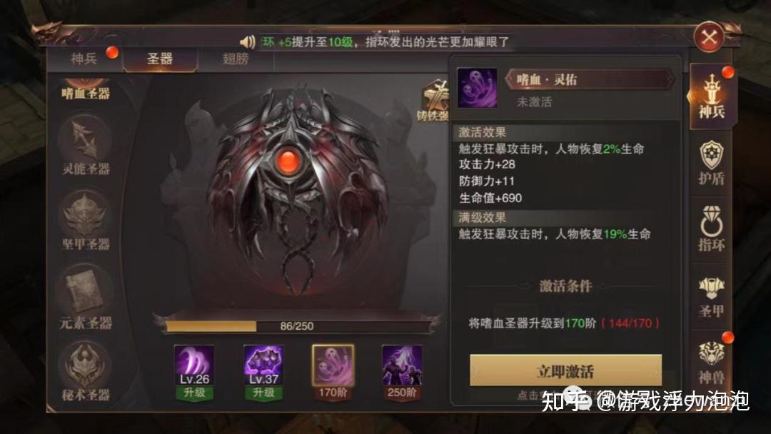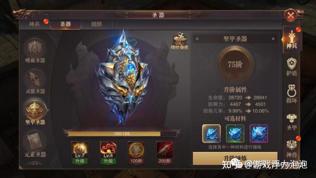 圣器分为:嗜血圣器、灵能圣器、坚甲圣器、元素圣器、秘术圣器。同样的,每个圣器都能提供很多的属性跟特殊技能,如图: