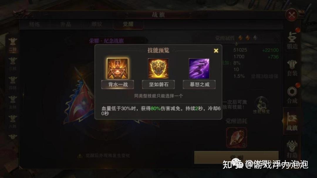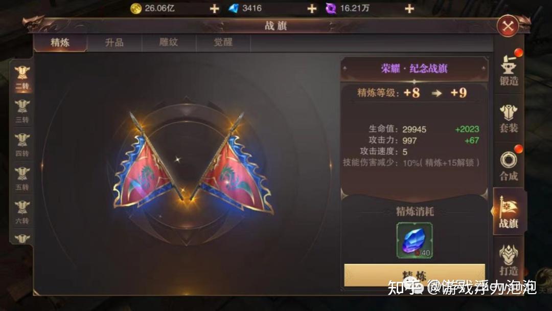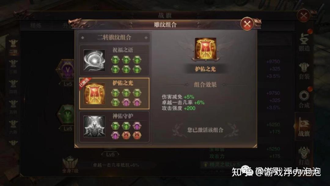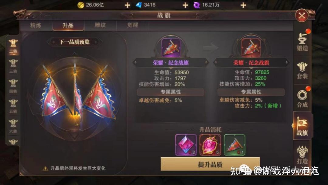 战旗的打造分为:精炼、升品、雕纹、觉醒。战旗精炼能提高战旗的基础属性值,还能触发一些特殊属性;升品除了能增加属性之外,还能获取相应的旗帜外观: