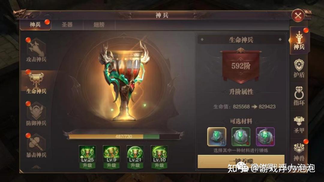 神兵分为:攻击神兵、生命神兵、防御神兵、暴击神兵、自然神兵、裁决神兵。每种神兵都能给自身角色提供非常强大的属性,还能获取一些特殊技能,如下所示: