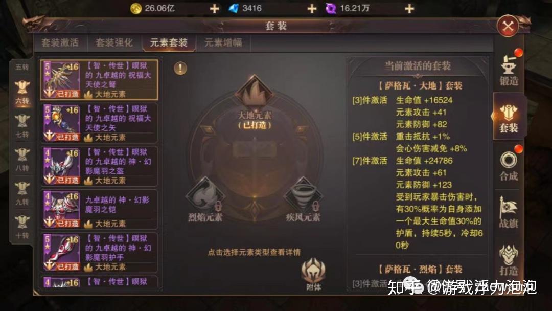 在角色6转时期,我们能获取元素套装,元素套装分为三种:大地元素、烈焰元素、疾风元素。每种元素的属性都不一样,需要我们根据自身的角色情况来选择合适的元素套装,如下图所示: