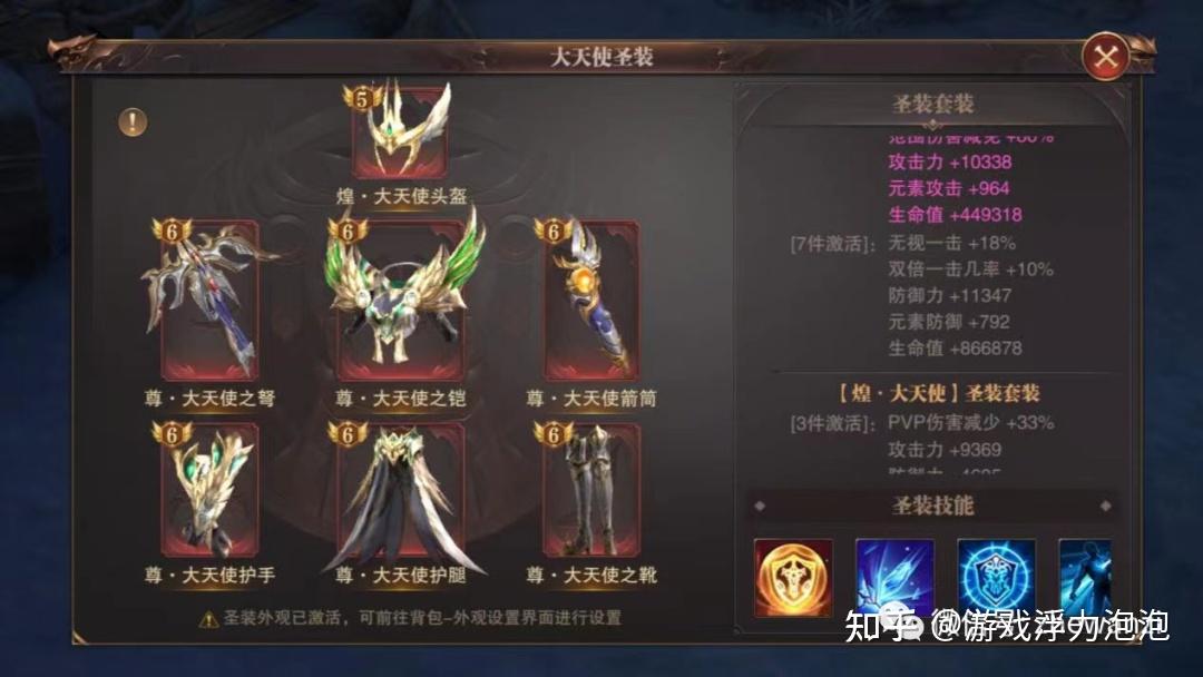 圣装共分为七件,分别为:武器、副手、护手、衣服、护腿、鞋子、头盔。每件加的属性跟战力都非常多,其中武器跟副手需要我们拥有祝福大天使武器才能激活,但是改版了之后,没有祝福大天的可以在神秘商人处每周购买5个大天使碎片来合成战损的大天使武器或者副手,以此来进行圣装的打造。在拥有大天使圣装3件、5件跟7件的时候,分别的激活一些强大的连锁属性,还能获取圣装技能,如下图: