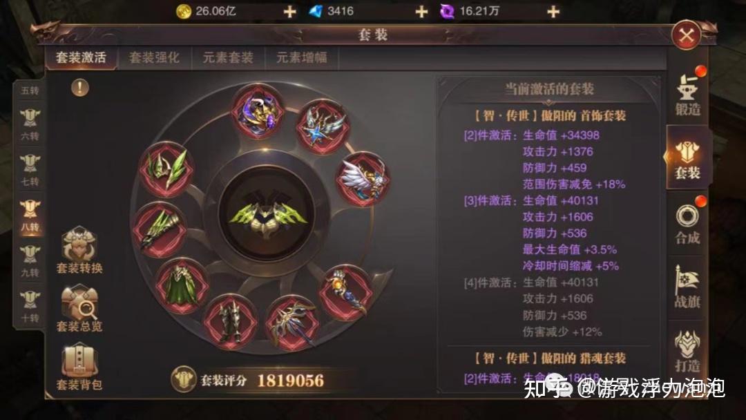 套装共分为三种:三角形套装,四边形套装及六边形套装。其中三角形套装是我们比较常用的套装,因为这是一种攻击型套装,并且加的战力也是最多的一种,六边形用的比较少,而四边形套装在8转的时候,能够提供冷却缩减属性,所以很多人在8转时期会去选择8转的四边形套装,即八转傲阳套,如下图: