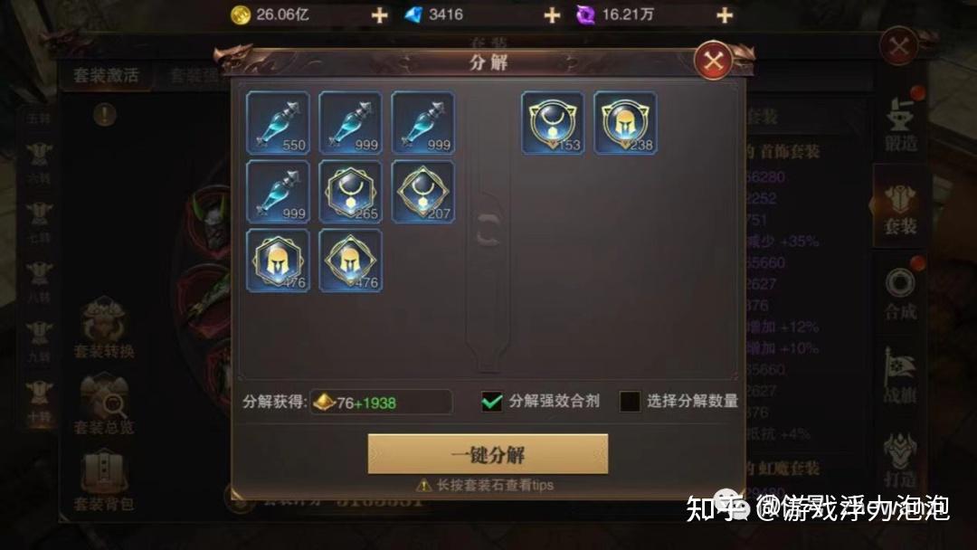 有了套装之后,我们还可以对套装进行强化升级,需要把我们用不到的套装分解成材料就可以了,如图所示:
