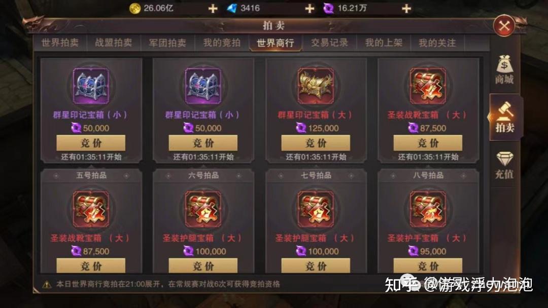 大天使圣装的获取除了武器副手之外,其他五件装备的来源有很多,比如拍卖行、世界服BOSS等等。拍卖行分为军团拍卖跟世界拍卖,军团拍卖是在每周1、3、5的军团活动魔王降临之后会有,世界拍卖是在每周的2、4、6晚上9点开拍,各位小伙伴可以提前准备好积分进行抢拍。如图: