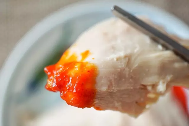 鸡肉很容易就撕下来,相当滑嫩。有点淡,蘸着韩式辣酱吃,好味~