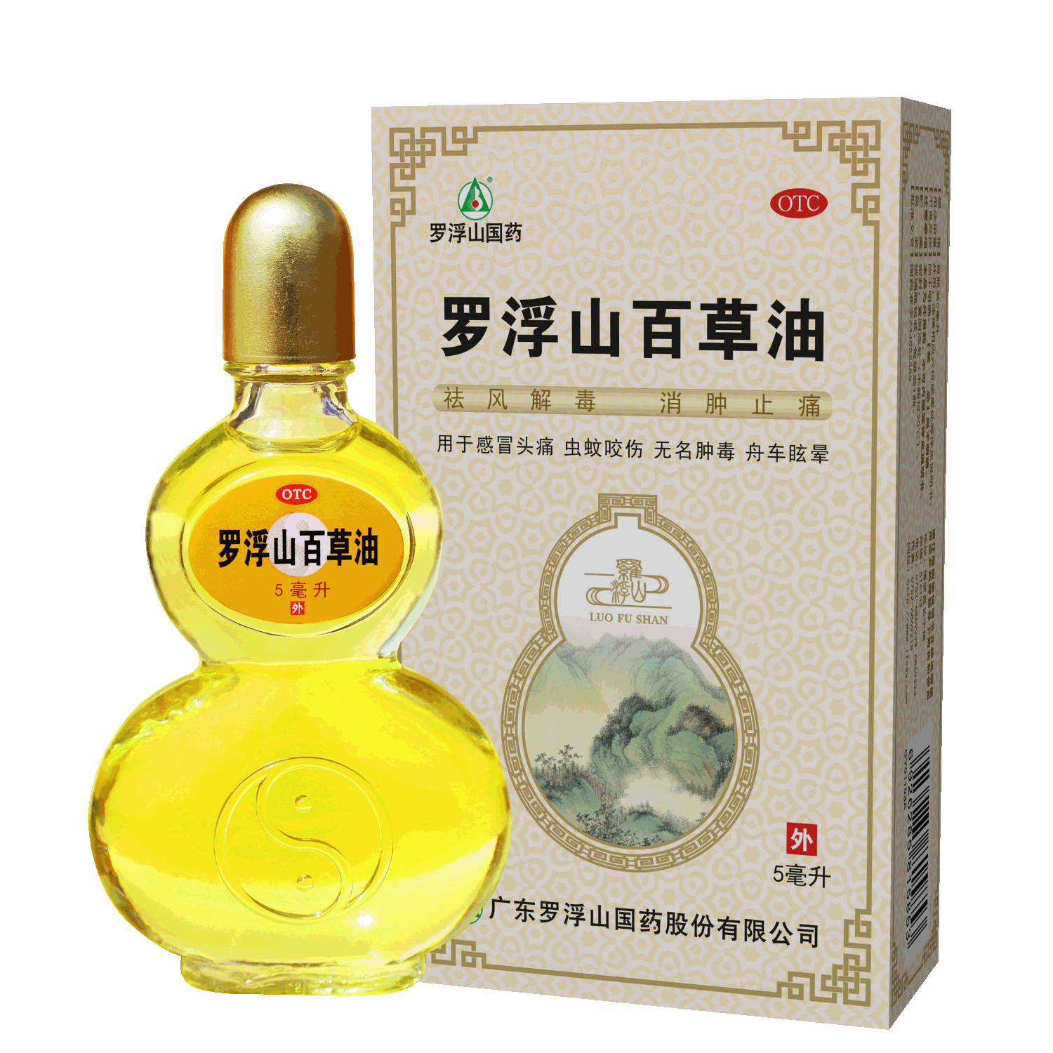 罗浮山百草油是由位于罗浮山脚的药厂采集百余种产于罗浮山的草药,采用古法提炼配制成的一种药油。其成分比例合理,药性平和,气味芬芳,药效显著,内服外用均可。内液呈青苔绿,气味和一般的驱风油差不多,但百草油更有草本的味道在里面。