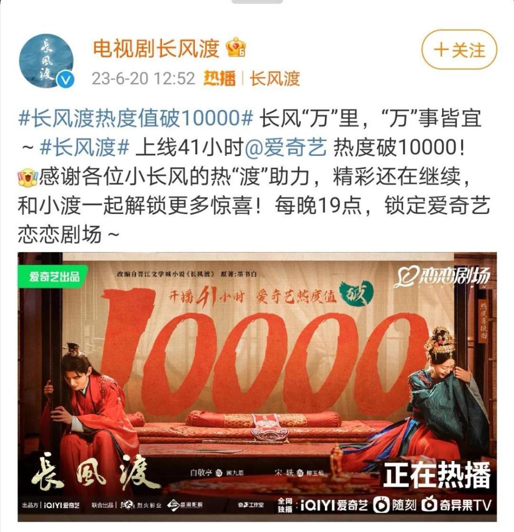 当然,还有一部上线41小时,爱奇艺热度就破10000的大热剧《长风渡》,热度和口碑都在上升。