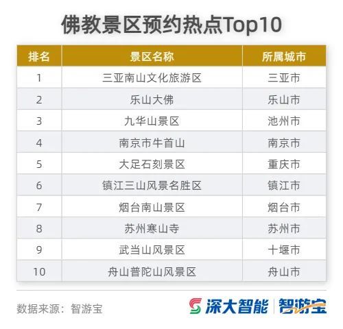非疫情风险地区旅游景区,在做好疫情防控的前提下,本着传承和弘扬中华优秀传统文化,开展各类新春祈福,寻年味,赏年俗等活动,为广大市民和游客奉上了精彩的春节文旅活动,宗教名山、佛教文化类景区备受游客青睐。智游宝数据显示,春节期间,佛教类旅游预约人次同比去年增长15%,其中,三亚南山、乐山大佛、九华山、南京牛首山、大足石刻、镇江金山、烟台南山、苏州寒山寺、十堰武当山等景区成为了游客新春祈福打卡热点,普陀山景区往年均排名较前,今年春节因浙江出现疫情,仅排名在第十位。
