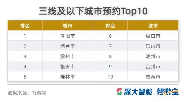 民众春节返乡过年,非疫情风险区域的三线及以下城市的旅游景区预约热度相比较一二线城市更高。智游宝数据显示,洛阳市、烟台市、滁州市、临沂市、桂林市、周口市、乐山市、池州市、台州市、威海市等三线及以下城市的旅游景区预约热度进入前十。