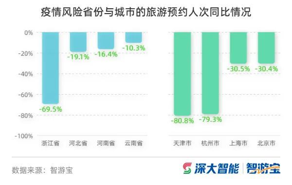 疫情中高风险地区“精准防控”,辖区内旅游和文化场所有序开放,但受疫情影响,疫情风险地区游客预约出游意愿明显降低。智游宝数据显示,春节期间,出现疫情省份与城市的预约出游人次同比降幅较大,其中,浙江省下降近70%,杭州、天津均下降80%左右。