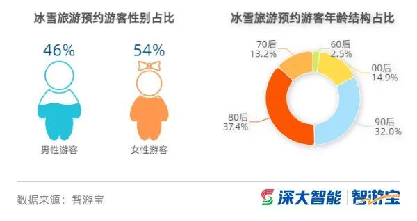 冰雪旅游活动是年轻人非常喜爱的社交型娱乐休闲活动,智游宝数据显示,春节期间,冰雪旅游预约的消费人群中,女性占比较大,约占预约总人数的54%。80、90后占比近70%,成为冰雪旅游的消费主体。值得注意的是,00后预约人次占比近15%,同比增长超过30%,是未来潜在的冰雪旅游消费群体,年轻群体参与冰雪旅游比例逐渐提升,冰雪旅游呈现“年轻化”趋势。