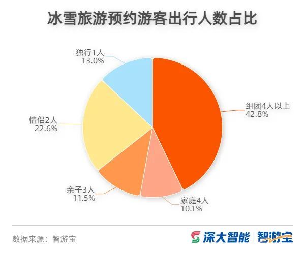 冰雪旅行是冬季旅游活动中备受非常受欢迎的休闲度假方式之一,智游宝数据显示,春节期间,预约冰雪旅游的消费者中有42%以上的游客选择结伴出游滑雪度假,超过21%的消费者选择和家人孩子一起参与冰雪活动,其次则是情侣冰雪游玩,占比超过22%,选择一个人出发的独行侠占比13%。