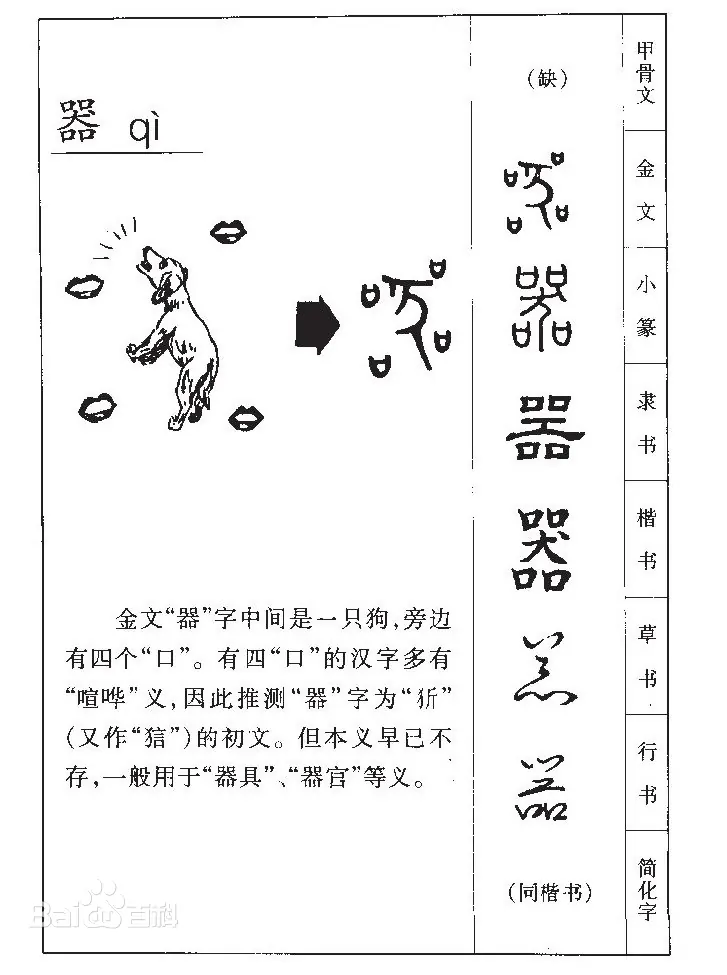 器在古代,狗不是人类的朋友,而是食物。古代有“狗屠”这一职业,说明古代中国人吃狗肉跟吃猪肉差不多。“器”的原义,大约是把狗大卸八块,变成一堆器官,放在容器里炖。类似的,“然(燃)”是烤狗肉;“哭”可能是屠狗之前的挣扎。