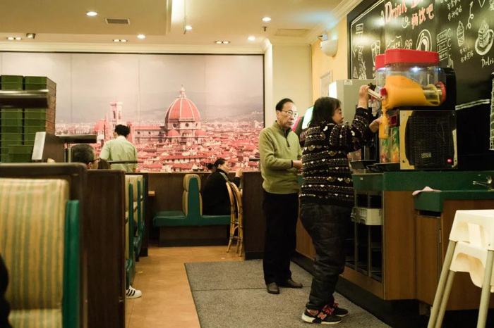 因为工作日的下午套餐是有优惠的,可以用很低的价格吃到热的茶咖啡,披萨和提拉米苏,所以很多老人会来。