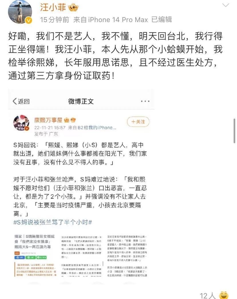 对于小S涉D的爆料,其实外界早已得知,特别是这两年大S与前往汪小菲的“互撕事件”中,汪小菲就曾透过社交平台公开喊话两姐妹服用违禁药物,且不经过医生处方,通过第三方身份证取药。