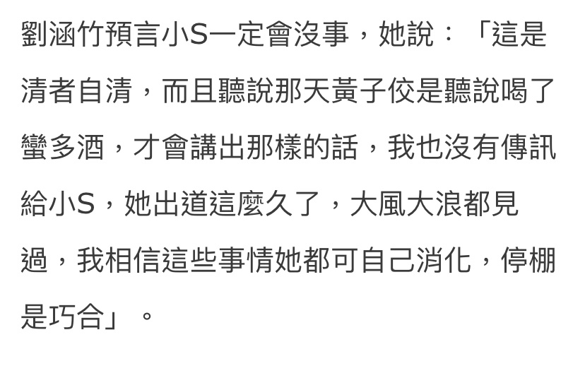 工作人员还表示:黄子佼当时爆料是在喝过酒的状态下进行的,因此才会讲出那样的话,真假难辨。小S出道这么久了,大风大浪都有见过,相信这些事情她都可以自己消化,停播只是巧合罢了。