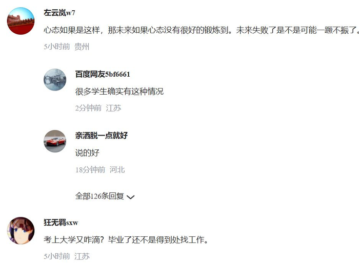 很多过来人就表示以后的路还长着呢,毕业之后找工作同样也是一个大坎,如果这个女生在找工作的时候遇到了一点挫折,是不是会比现在表现出来的更脆弱?这种情况真的应该改一改了,否则以后肯定会因小失大。