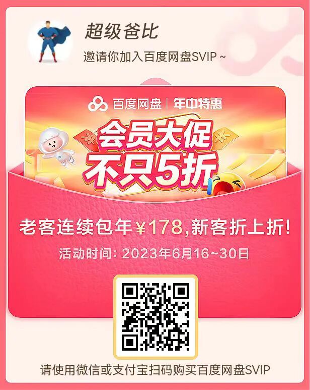 ①活动价格:与百度网盘 App 的官方年中大促价格一致,老用户¥178,新用户折上折!