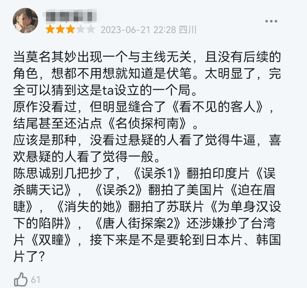 网友盛传《唐探系列》中有《白夜行》《双瞳》甚至是《柯南》的影子,而《误杀》系列干脆都表明了就是翻拍,且一部一翻拍。