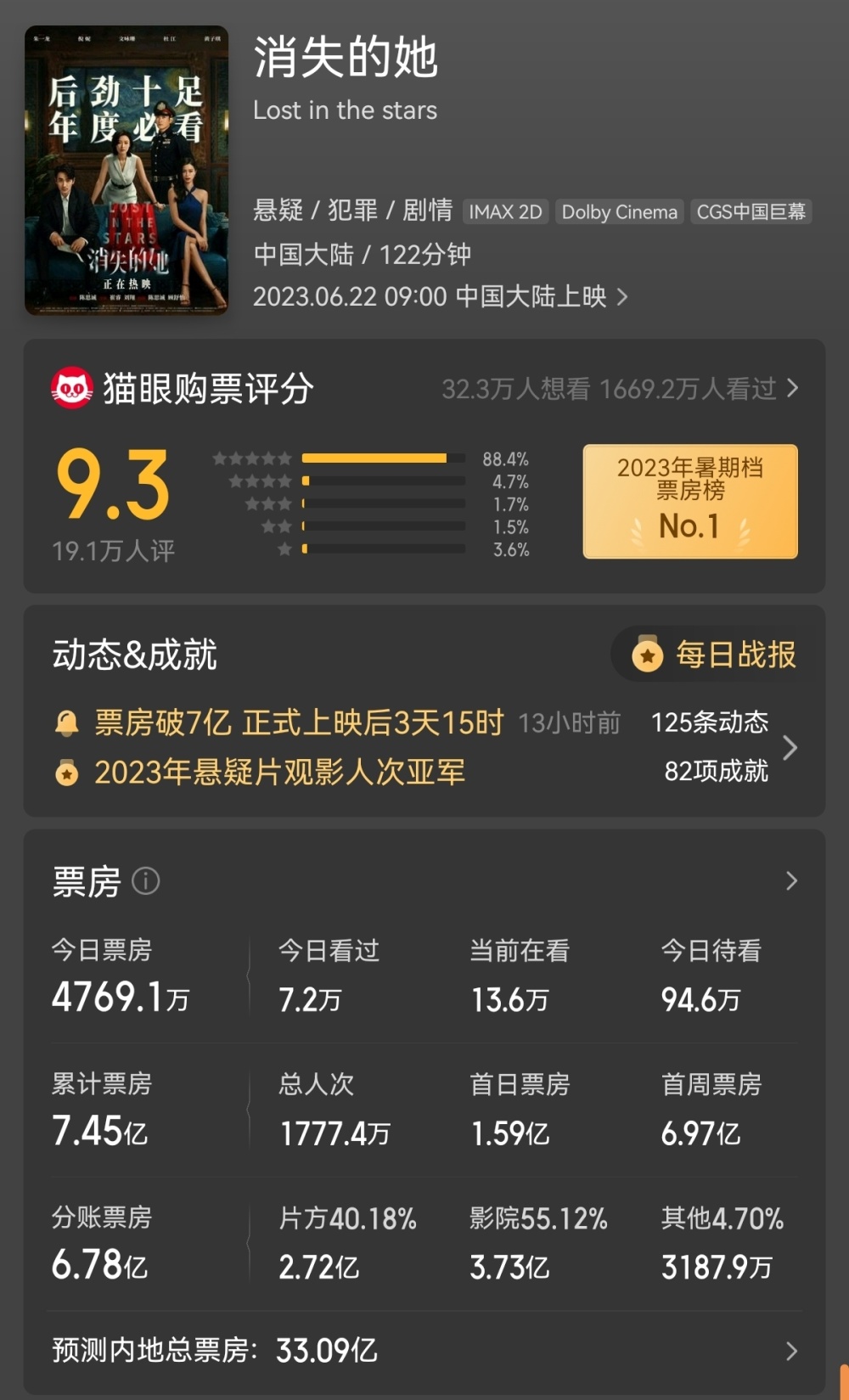 截止到发稿前,《消失的她》上映5天,累计票房7.45亿,最终预测更是从7亿一路飙升到33亿。