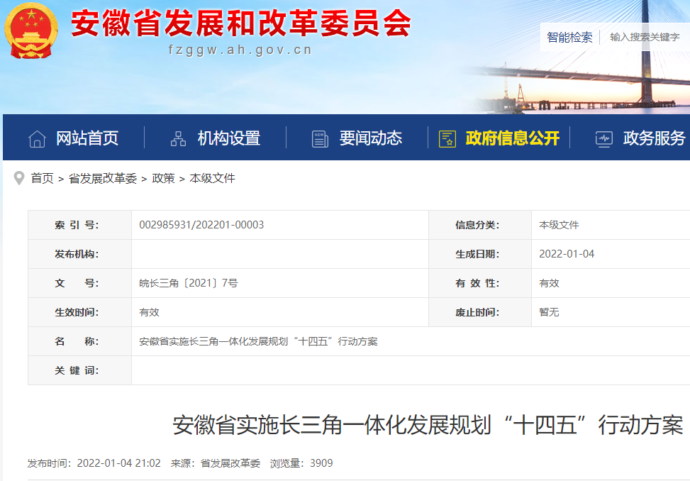 近期,安徽省实施长三角一体化发展规划“十四五”行动方案发布。
