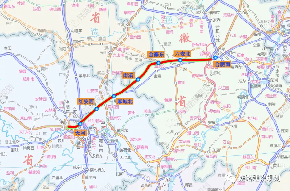 全线共设车站9座,合肥南(既有)、长安集(既有)、六安北、金寨东、南溪、麻城北(并既有站)、红安(并既有站)、长江新区、武汉天河,新建桥梁74座208.928km,隧道17座73.651km,桥隧比88.11%。总投资达872.3亿元。