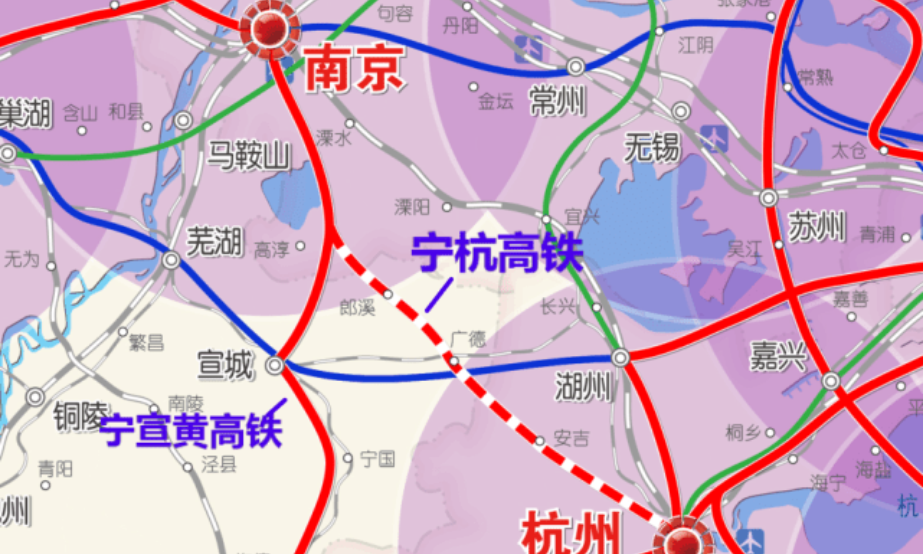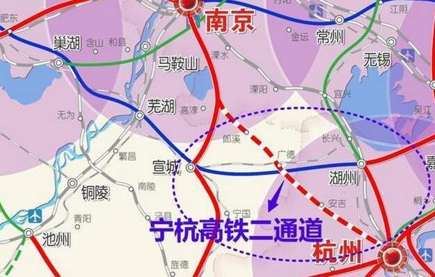 宁杭高速铁路建设于江苏与浙江境内,从线路上看,是有点绕的,所以宁杭第二高铁通道就稍微拉直了一些,不仅经过江苏与浙江,还经过安徽,规划从南京高淳站引出,经郎溪、广德、安吉、到杭州,全程168公里,设计时速350公里。