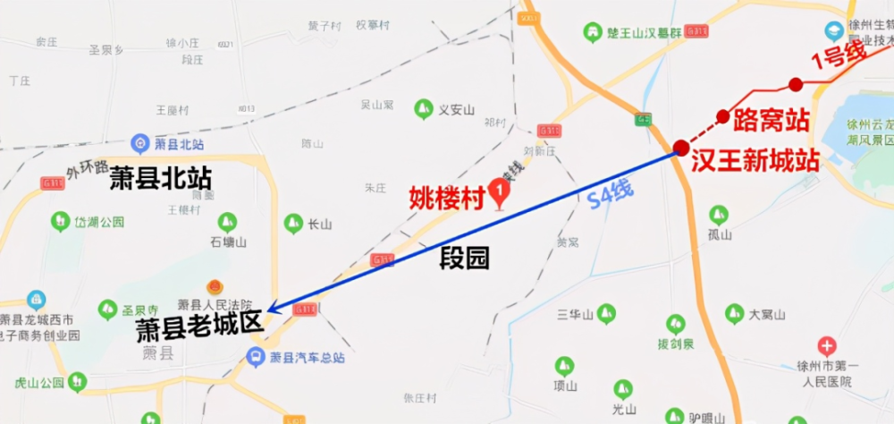 规划中的徐州地铁S4号线(又称徐萧城际、萧县轨道交通),是徐州地铁1号线延长线。市域(郊)铁路徐州至萧县线自城市轨道交通1号线起点汉王新城站引出,向西南方向行进,经过G30、姚楼村,至安徽省宿州市萧县,线路全长13.5km,沿线共设4座车站,平均站间距4.5km,徐州境内长度约5.3km。 同时线路预留进一步延伸至淮北市的条件。