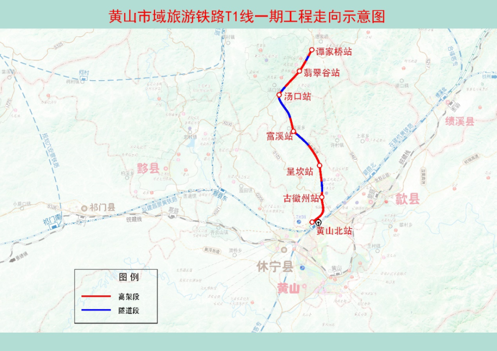 作为黄山市旅游铁路线网规划的重要组成部分,黄山市域旅游铁路T1线一期工程起自黄山北站综合交通枢纽(新机场站至黄山北站为近期预留段),终至黄山风景区东大门,沿线串联3处5A及4A级景区。线路起自黄山北站,出站后线路继续向东北方向前行,分别在西溪南、潜口(5A)设古徽州站,呈坎景区(5A)、富溪设呈坎站、富溪站,至黄山南大门(5A)汤口镇设汤口站,于翡翠谷景区(4A)、黄山东大门(5A)设翡翠谷站、谭家桥站。沿线山体较多,坡度变化较大,有条件的区段主要沿G3京台高速路侧敷设。