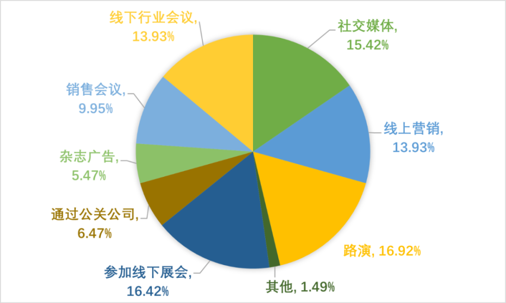 在对45个国家旅游部/使领馆/旅游局(代表处)等调研中发现,绝大多数的旅游部/使领馆/旅游局(代表处)等已通过社交媒体、线上营销、路演、公关公司、和广告等方式在中国市场上推广其目的地及相关旅游产品。其营销推广方式占比如下图: