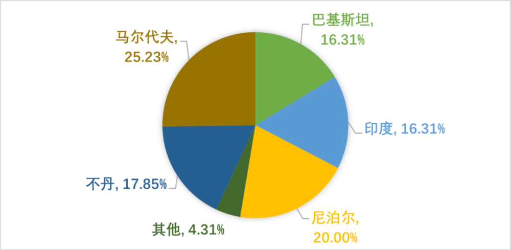 中国旅游运营商有兴趣获悉南亚各国家的资源供应商占比分别是:马尔代夫25.23%;尼泊尔20%;不丹17.85%;巴基斯坦16.31%;印度16.31%。