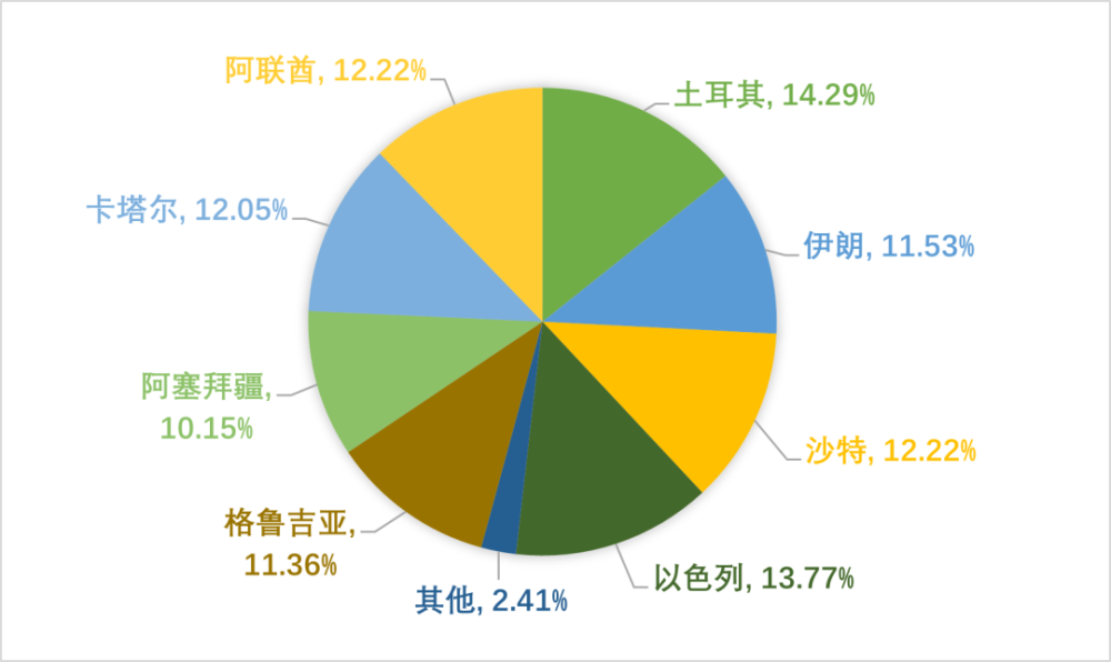 中国旅游运营商有兴趣获取西亚各国的资源供应商占比分别是:土耳其14.29%;以色列13.77%;阿联酋12.22%;沙特12.22%;伊朗11.53%;格鲁吉亚11.36%;阿塞拜疆10.15%。