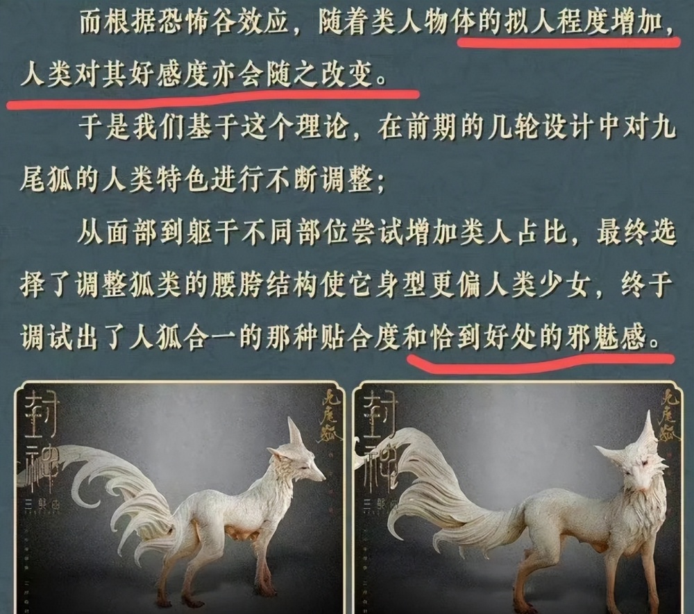 而且众所周知,妲己与纣王在一起时也根本没进入哺乳期。这种莫名其妙的形象完全就是创作者故意而为之,在创作介绍里写着:“调试出了人狐合一的那种贴合度和恰到好处的邪魅感。”