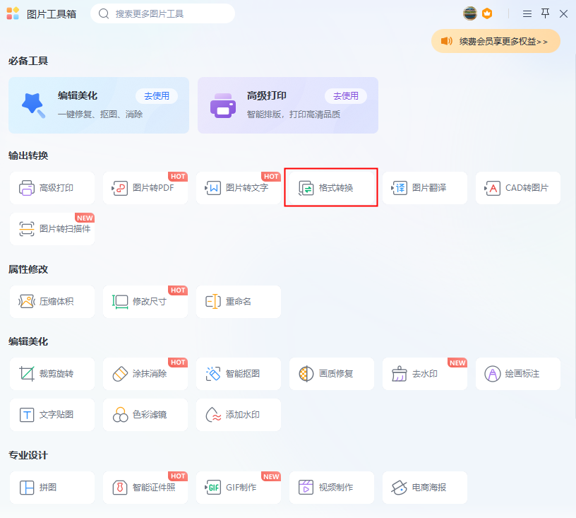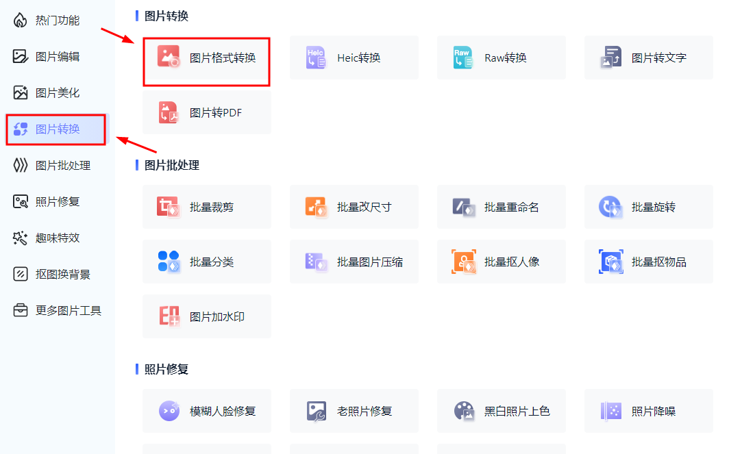 先找到图片转换的功能分区,然后点击图片格式转换
