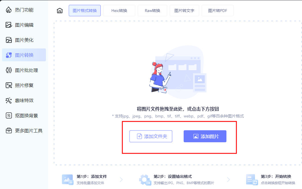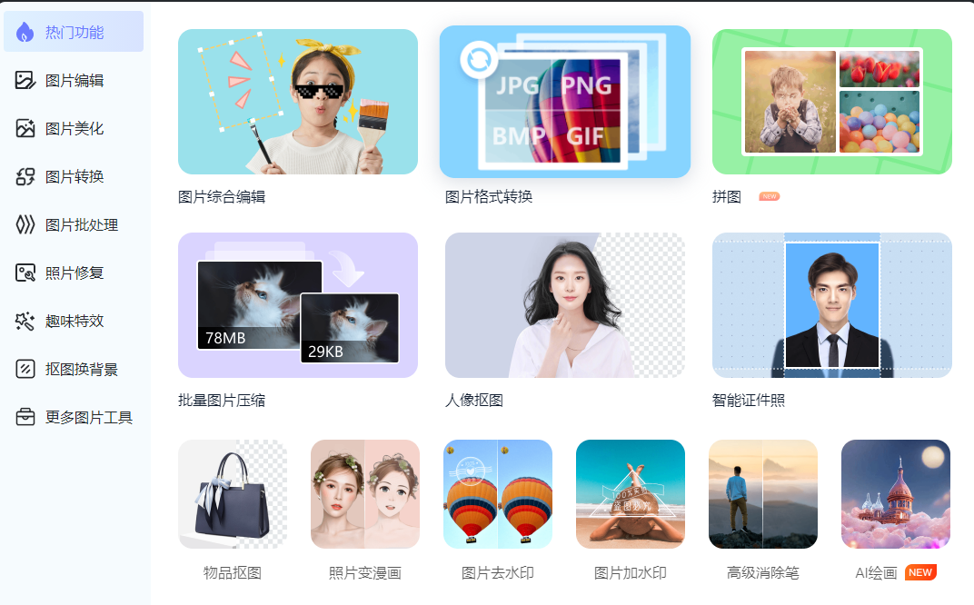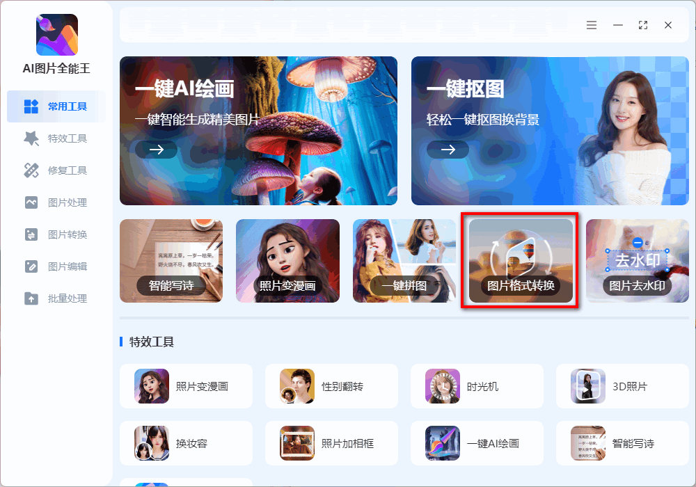 可以用格式转换工具完成这一操作,我这里用到的是【AI图片全能王】这款软件,里面有多种图片处理效果,像抠图、格式转换、去水印等等。