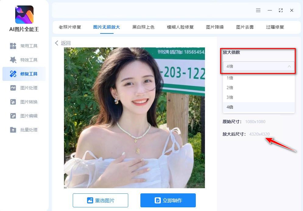 在“修复工具”中点击“图片无损放大”功能导入图片,选择合适的放大倍数(可以看到放大后的分辨率尺寸是增大的,所以存储空间也会随之变大)等待处理完毕,保存图片就好啦~