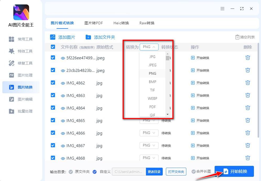 在这里选择转换格式,最顶端的是设置统一转换为XX格式,也可以单张单张的分别设置转换成什么格式,非常人性化~