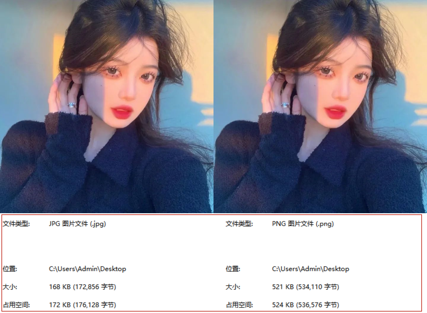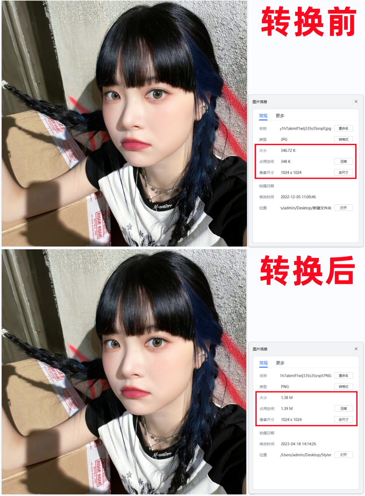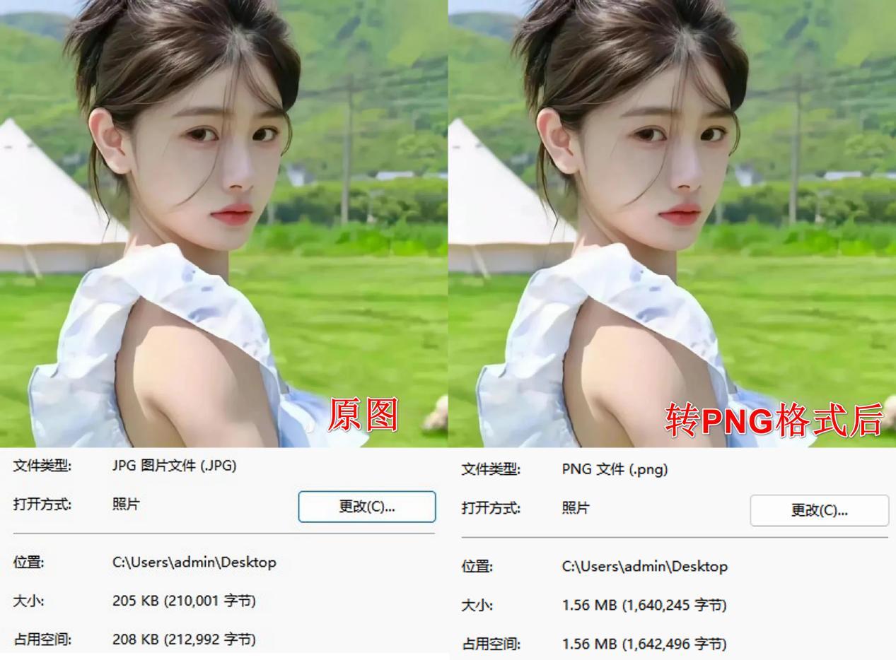 转换后的图片除了存储变大外,其他方面都没有任何变化,像图片尺寸、质量等等。