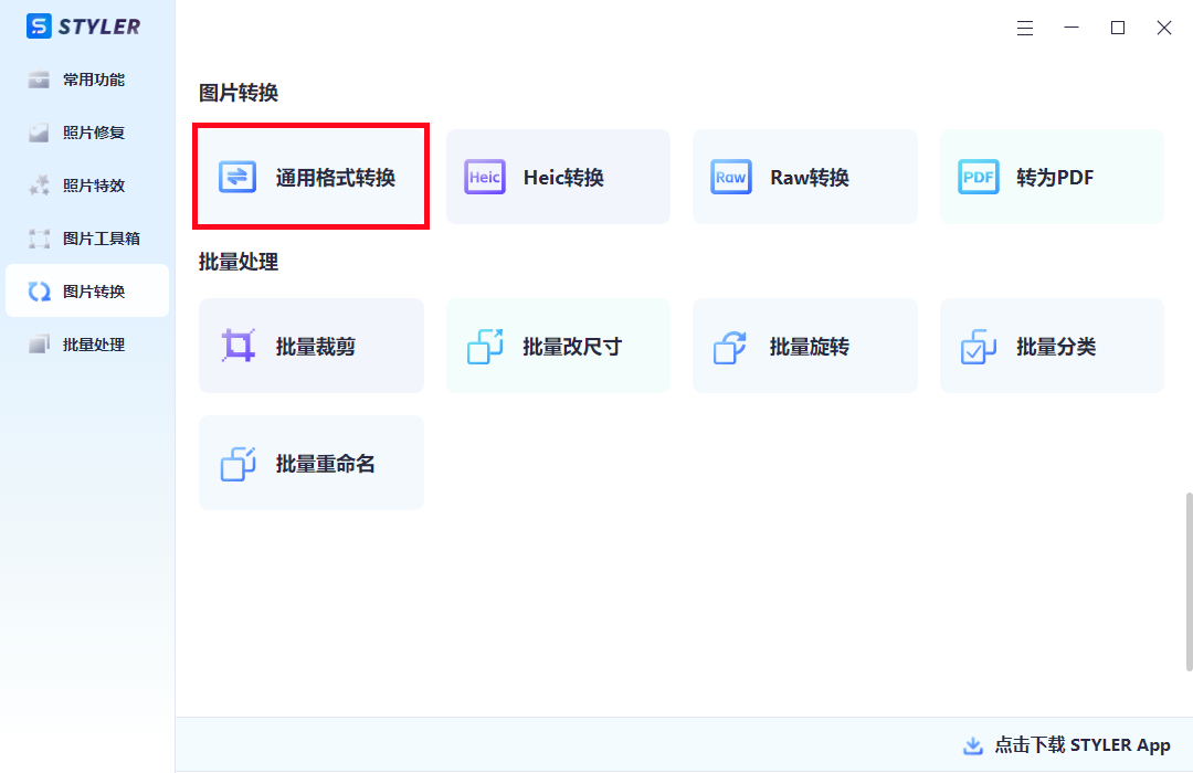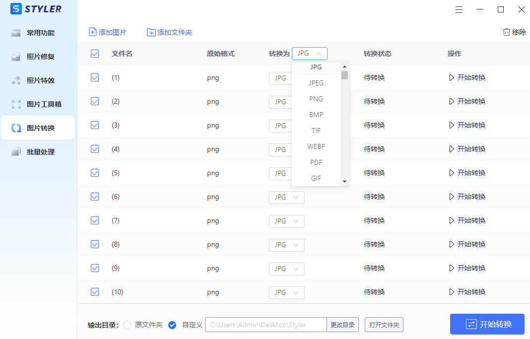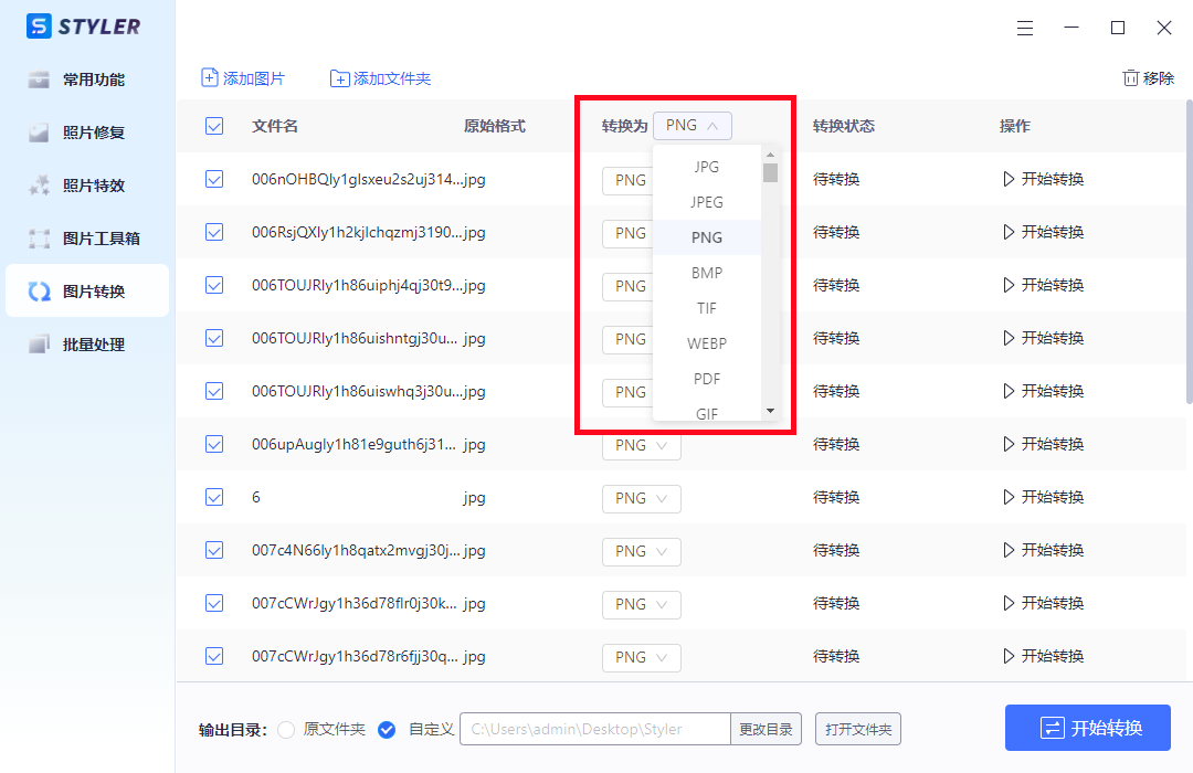 市面上图片格式转换工具有很多,我自己在用的是Styler,其支持jpg、png、bmp、tif、webp等百余种图片格式的互相转换,而且支持批量转换,一次性能上传多张图片同时进行转换,大大提高了我们的图片转换效率。
