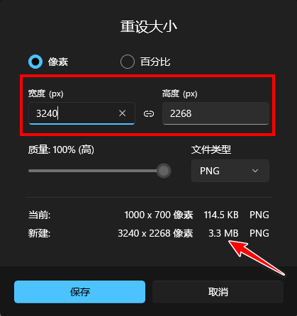 满意后,再对图片进行保存,便能在图片尺寸不变的情况下,增大图片存储啦~