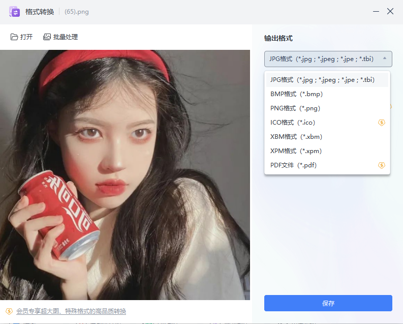 在“格式转换”的功能界面,设置输出格式,点击“保存”便能完成格式转换,还可以添加多张图片进行格式转换,很是方便。