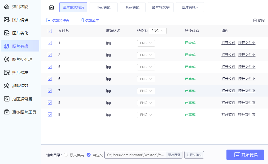 在图片转换中找到“通用格式转换”,上传需要转换格式的图片,设置转换格式,点击“开始转换”,几秒内就能完成图片格式的转换。