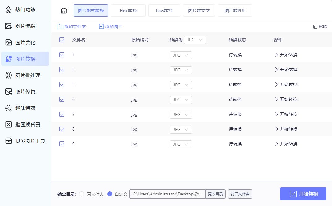 我这里上传了文件夹,一共九张JPG图片一起批量转换格式